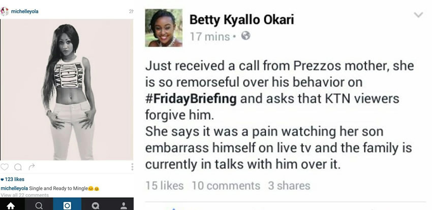 After the self-proclaimed King of Bling Rapper CMB Prezzo was invited to guest anchor on KTN’s Friday Briefing with the ever sexy Betty Kyallo. The former Big Brother finalist embarrassed himself badly, he went on giving her unnecessary hugs, touches and comments. At some point he stood up and even started dancing and his song that was being played in the background. When he was asked if he was in a relationship, the singer did not acknowledge his current girlfriend Michelle Yola, but instead he said he was in a relationship with Beyonce who was trying to double play him with Jay Z. After the whole saga the show went on a break and he never came back. The girlfriend later posted on her Instagram page that she is single and ready to mingle. Betty Kyallo posted on her Twitter page, Just received a call from Prezzos mother, she is so remorseful over his behavior on #FridayBriefing and asks that KTN viewers forgive him. Prezzos mum says it was a pain watching her son embarrass himself on live TV and the family is currently in talks with him over it.During divorce with the former wife Daisy, she cited that he was allegedly aheavy alcoholic drinker and consumes narcotic drugs.
