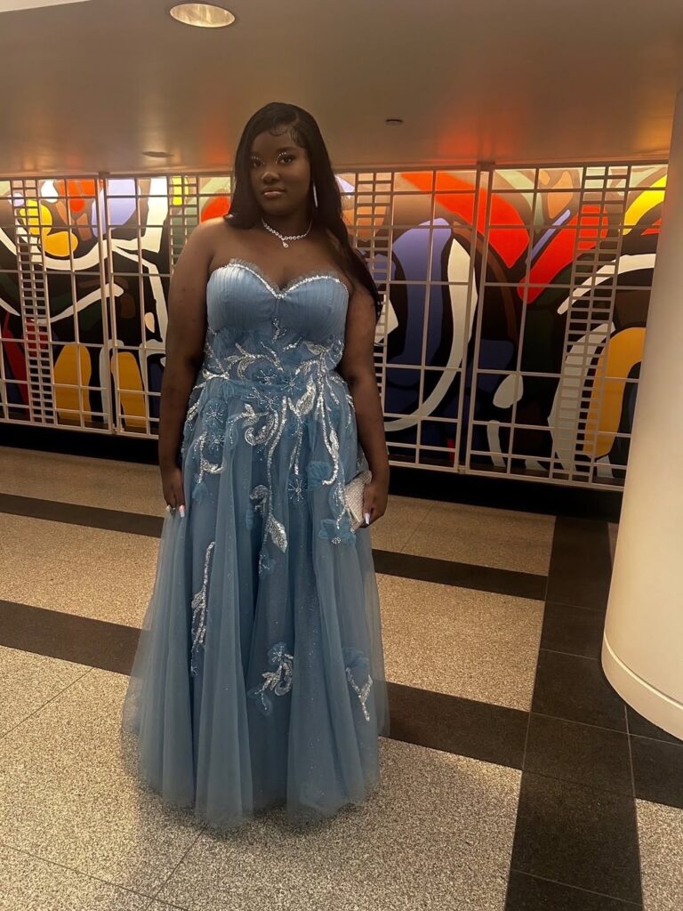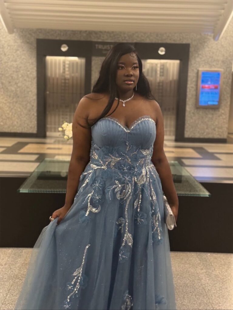 Myra delighted fans by sharing stunning photos of her prom, captioning the moment, “About my young queen daughter’s #Prom2025 last night. #GorgeousInBlue👗🦋🩵 #Prom2025Ready. God is so Good!🙏🏾” Her daughter looked radiant in an elegant lace dress with a flattering sweetheart neckline, adorned with intricate silver embroidery.