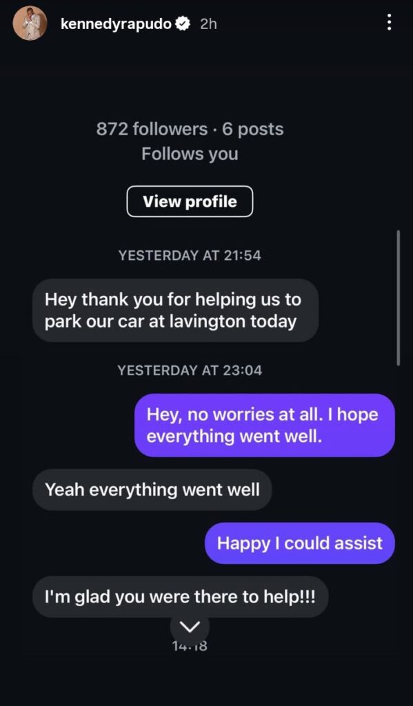 According to Rapudo, the incident occurred on August 3, 2025, when he was approached by a group of women seeking assistance to park their car. In a detailed statement shared on his Instagram, he said that he merely helped them out of courtesy, declining a request for a selfie and maintaining no further contact.