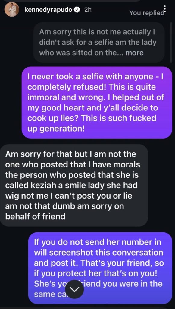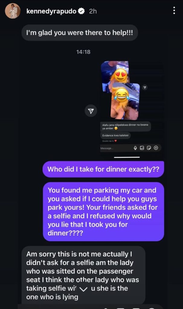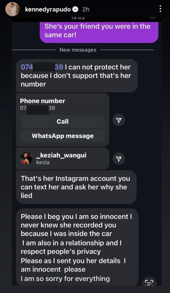 Screenshots from private conversations reveal that one of the women involved also distanced herself from the false narrative, admitting that another member of their group named Keziah Wangui had fabricated the story. The individual, whose identity has been withheld, provided contact details of the alleged culprit, further supporting Rapudo’s story.