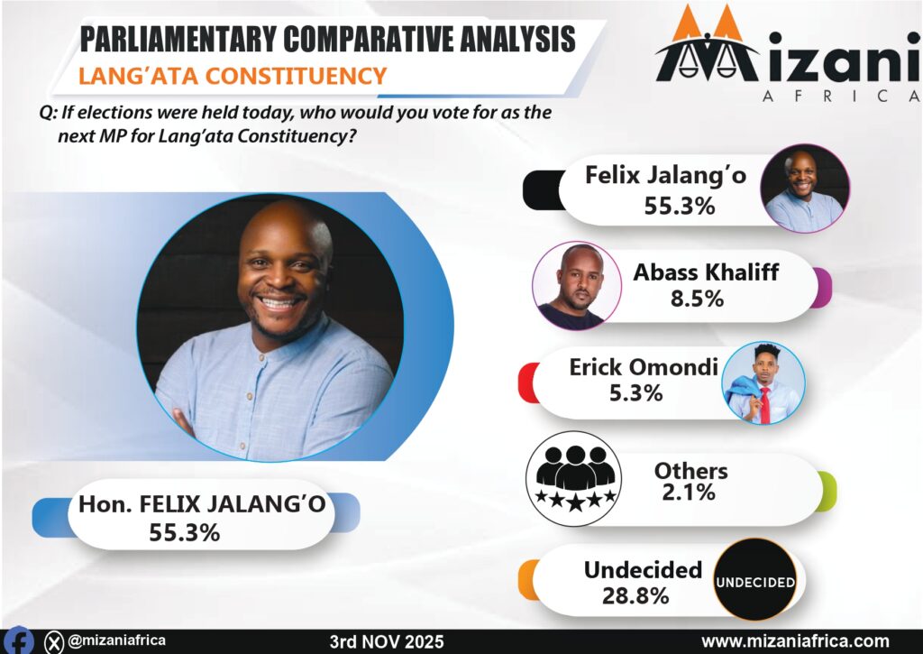 According to the Mizani Africa analysis, the poll “reflects broad voter confidence in his leadership.” It attributes Jalang’o’s strong showing to his “visible record in infrastructure improvement, youth empowerment, and social programs,” which “continues to resonate” with constituents. The poll further notes that his “accessibility and energetic style of representation have redefined engagement in Lang’ata.”