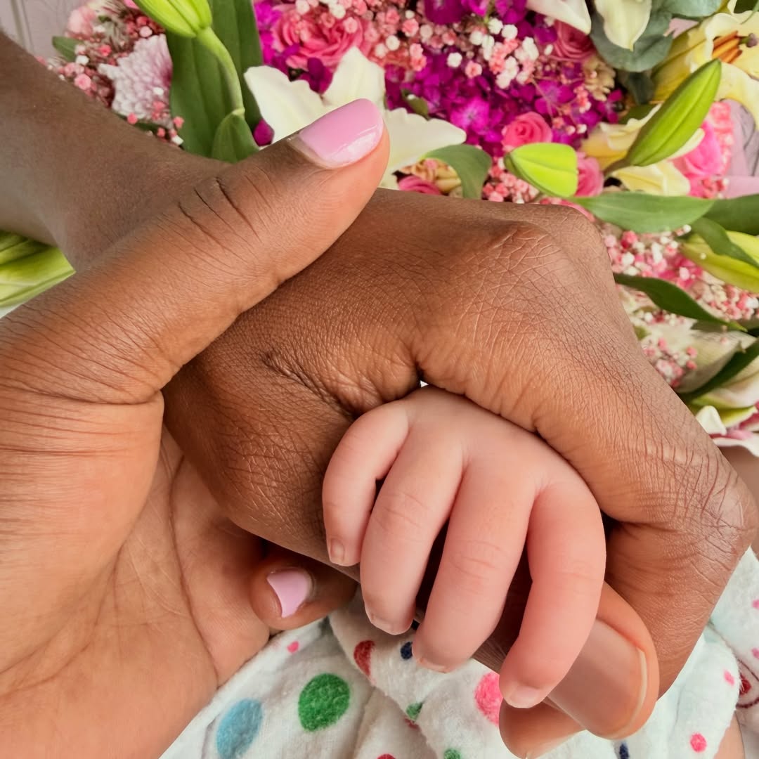 The overjoyed mother shared the news with a tender photograph holding her newborn’s hand, revealing the baby girl’s name and birth date.